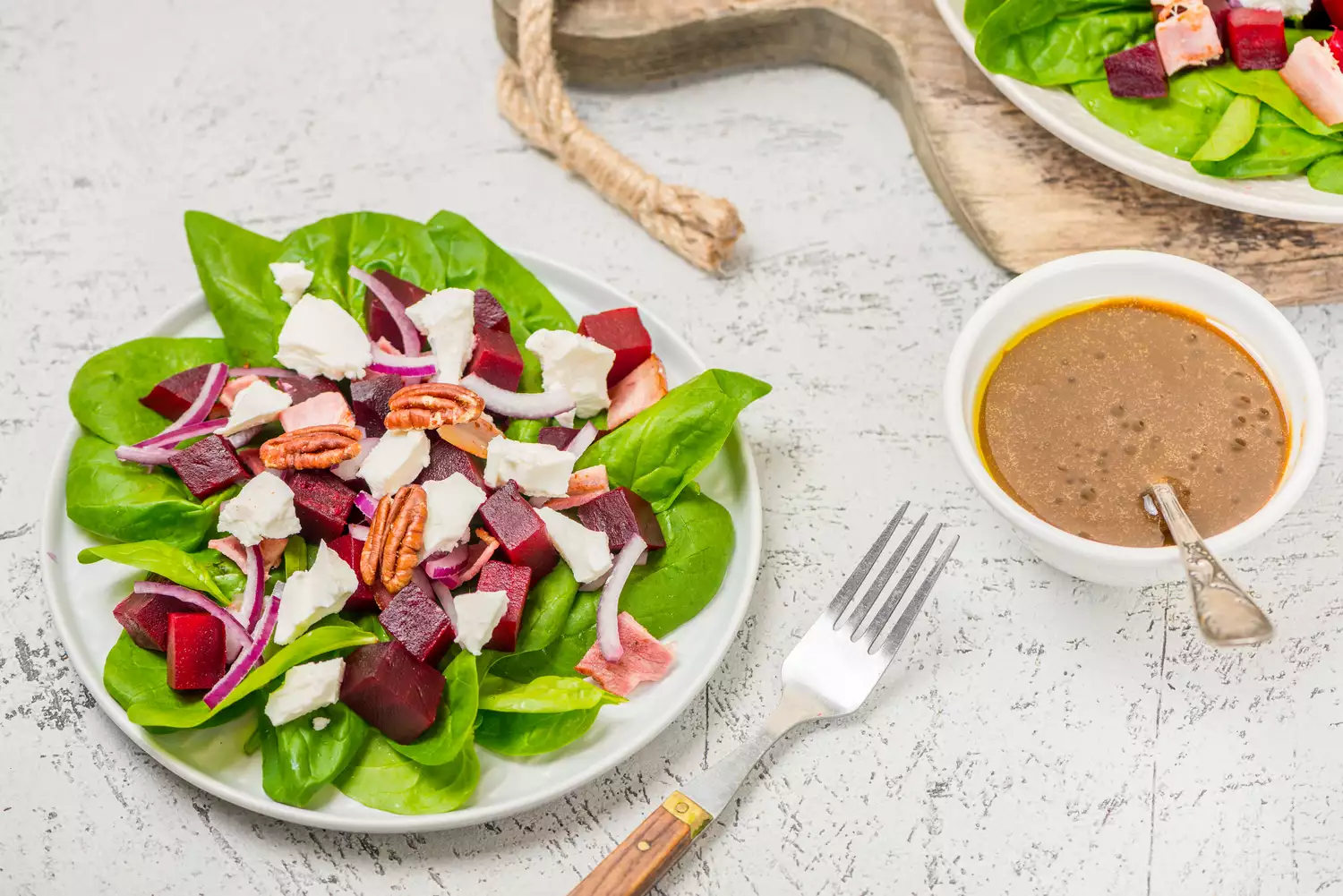 Salade de betteraves avec épinards et vinaigrette balsamique au miel.